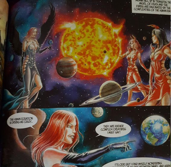 After waiting so long for the comic, I don’t actually have a lot to say about it. It is a 28 page retelling of the story, and it looks really cool. I do like the art, done by Felix Vega. It looks like a story made of old school heavy metal art; especially the scenes in Transitus with the Angel of Death and her Furies. Of course, the more I look at this picture, the sillier the boobs look.