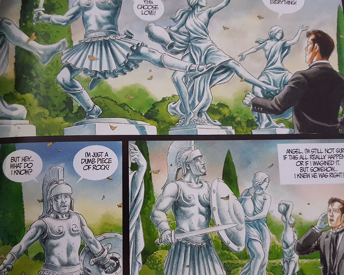 A few tracks later we get Talk of the Town which is another stand out. Any time you can get a hurdy-gurdy in a metal song you’re winning. It’s followed by the combo of Old Friend and Dumb Piece of Rock. The latter of which is the only appearance of Toehider’s Mike Mills on this album. Fittingly, Dumb Piece of Rock has a bit of a Toehider vibe, and is a nice, fun silly tack on an otherwise bleak album. It’s equally as fun and silly in the comic, where all the statues in the garden start dancing and Daniel admits he may have just been imagining things.