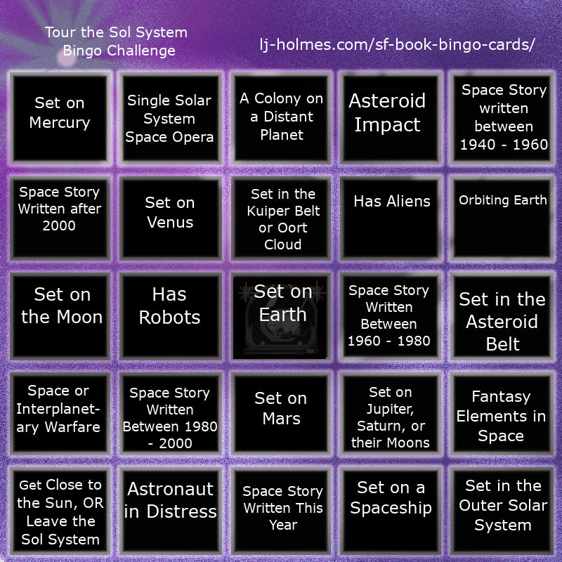 This isn’t a normal bingo card. I call this the Tour the Sol System Bingo Challenge. In this challenge, the goal is to read stories full of space adventures and journeys across faraway planets, without leaving our own backyard. Books read for this challenge must be set within our own Solar System. (or a solar system/planet that could be ours.) Behold, the card.