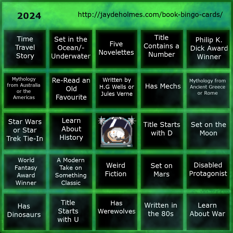 First things first, I have a new Book Bingo Card for 2024. I’ve just rolled my Bingo Card for the year, and look forward to filling in some of these squares. Feel free to play along with this card, or leave a comment if you want me generate a new card for you. I made a card generator a few years ago, and making new cards has always been a highlight of the new year for me. I have a page of sample bingo cards and previous yearly challenge cards HERE.