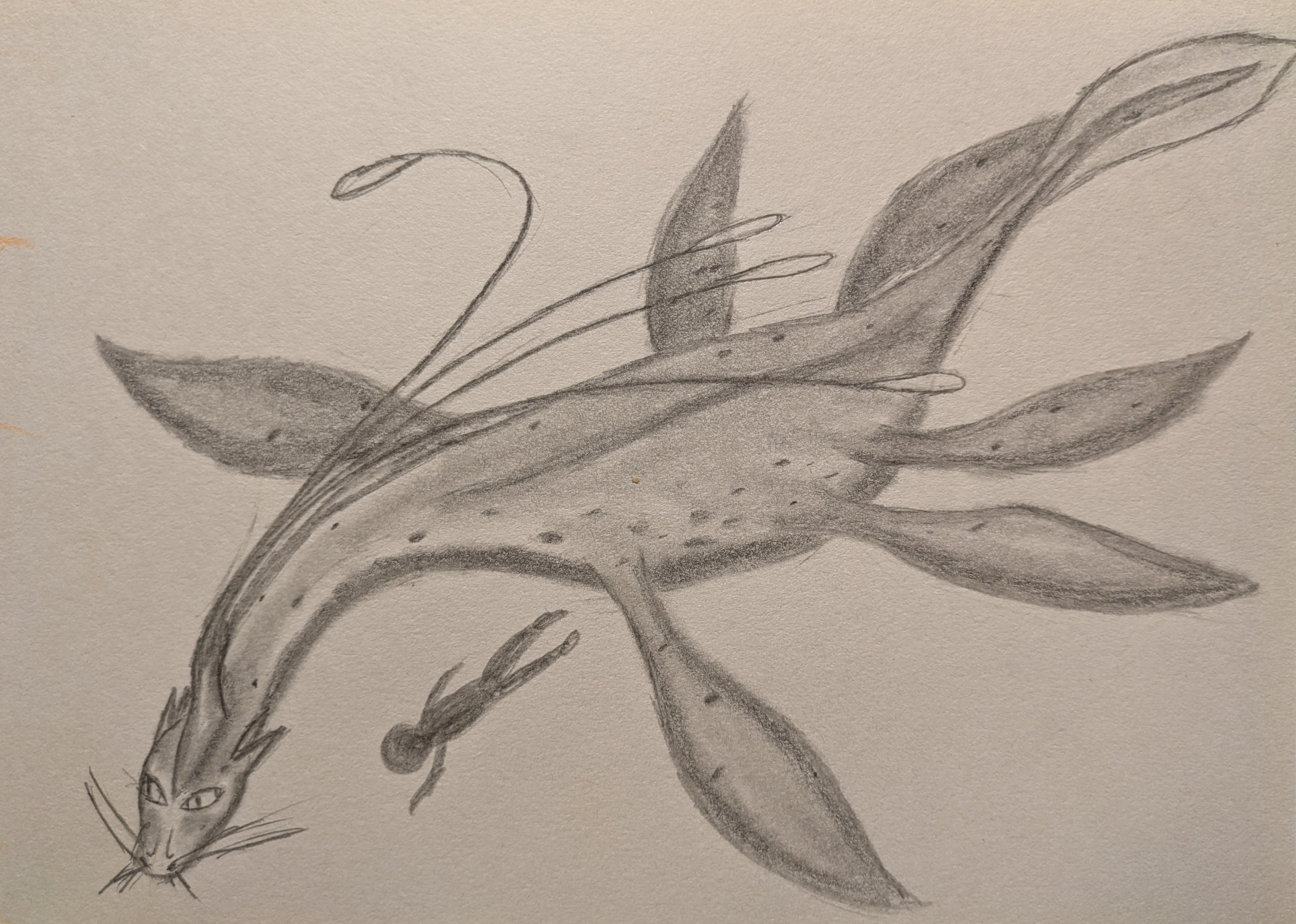 Levifins are theorized to be the largest creatures amongst both worlds. Levifin skulls are as long as an adult Human, and it is claimed that a telepathy tendril owned by the leader of the Keepers of the Empty Forest is said to stretch between her garden to her mate on the other side of the hill that separates them¹. They are fat creatures with long necks, decent-sized tails, six paddle-finned legs and a single horn that ends in long, flexible telepathy tendrils with bioluminescent bulbs at the end. They cannot leave the ocean without dying, but they are reptiles rather than fish, and most come to the surface for air.